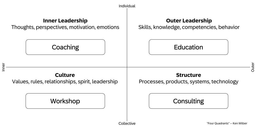What I like most about this model: it shows how to address each category (via Coaching, Education, Consulting or Workshops) and gives guidance and clarity on the multiple factors that play into our experience!